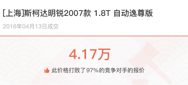 下面一起來看下開了不同公里數(shù)的斯柯達(dá)明銳在二手車拍賣平臺(tái)上賣了多少錢: