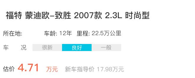 該款車2009年上牌啟用,行駛22.5萬公里,新車指導價17.98萬元,車況良好的情況下,成交價1.25萬。